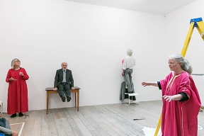Image: Members of The Theatre of Mistakes performing a Free Session at Raven Row, 29 June 2017. Photograph by Mark Blower