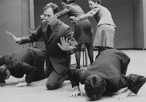Going is a fugue for five performers in five acts, arranged from mannerisms of departure. It concerns going, or attempting to go, when the participants are bound together as closely as the strands of a knotted ring. Attempting to be each other, as opposed to a character, every performer has to learn all the parts, and thus every move and each gesture. Each weaves a role identical to that of the others, into different moments, but of the same role.