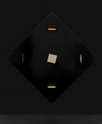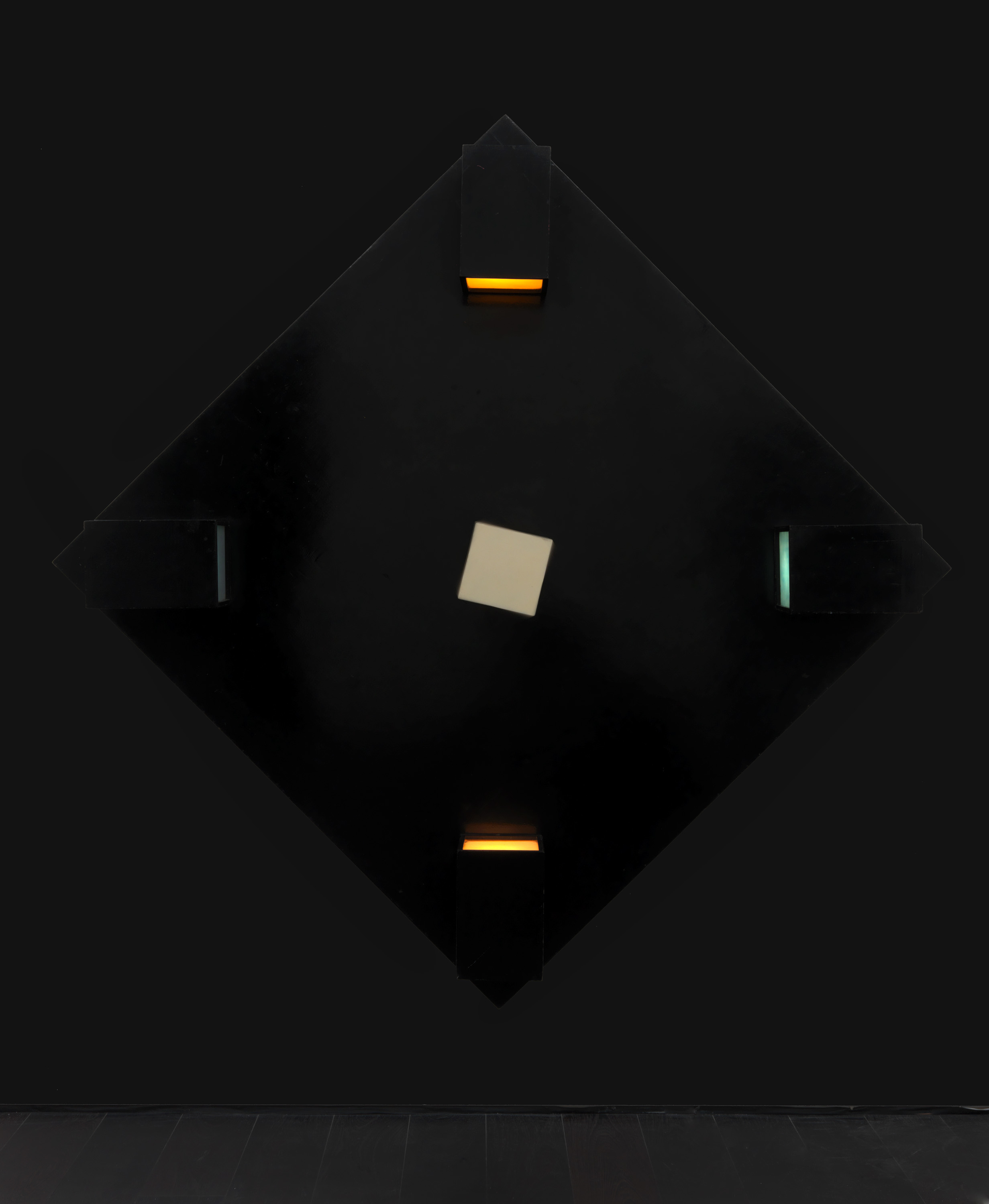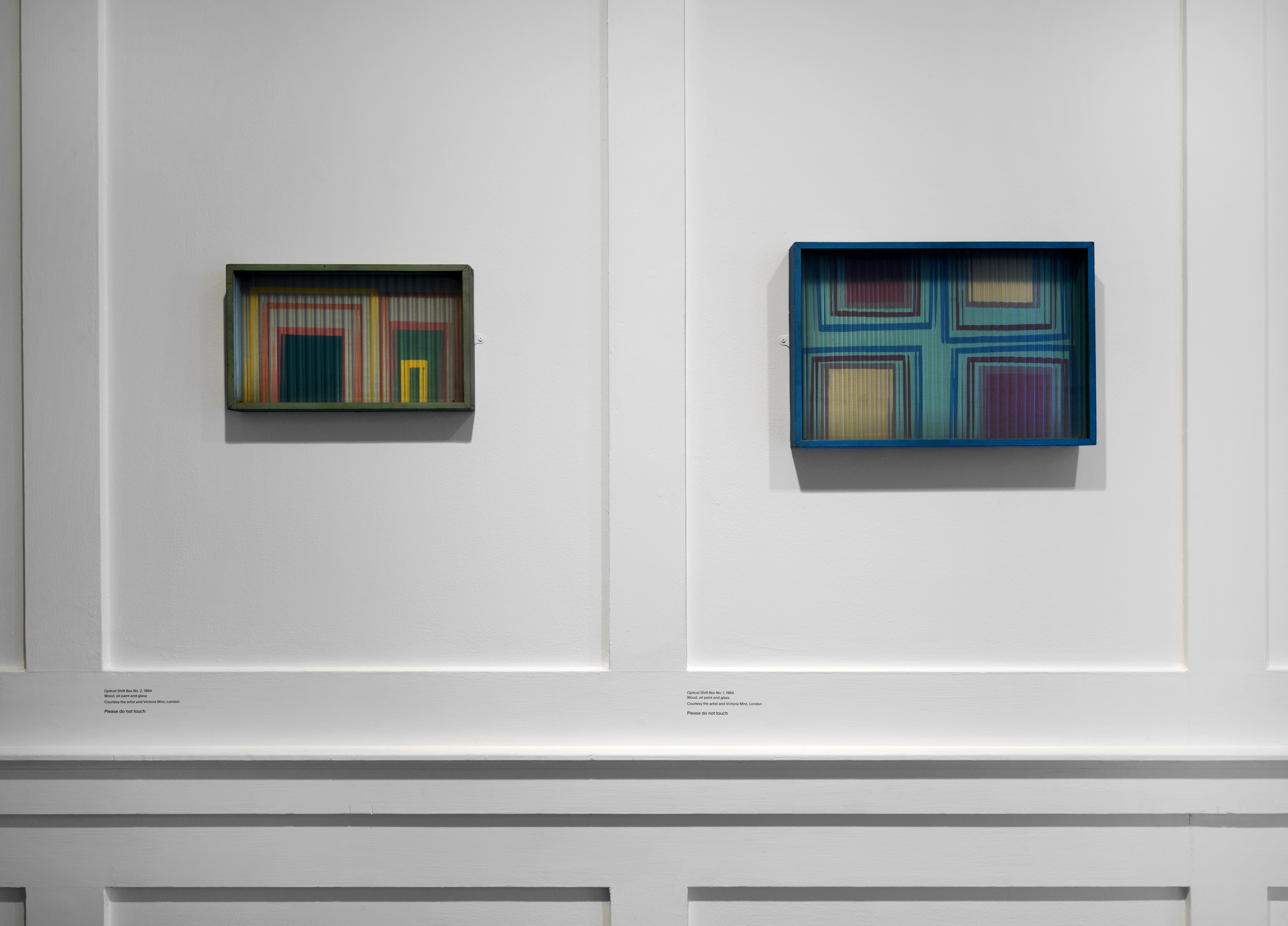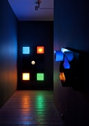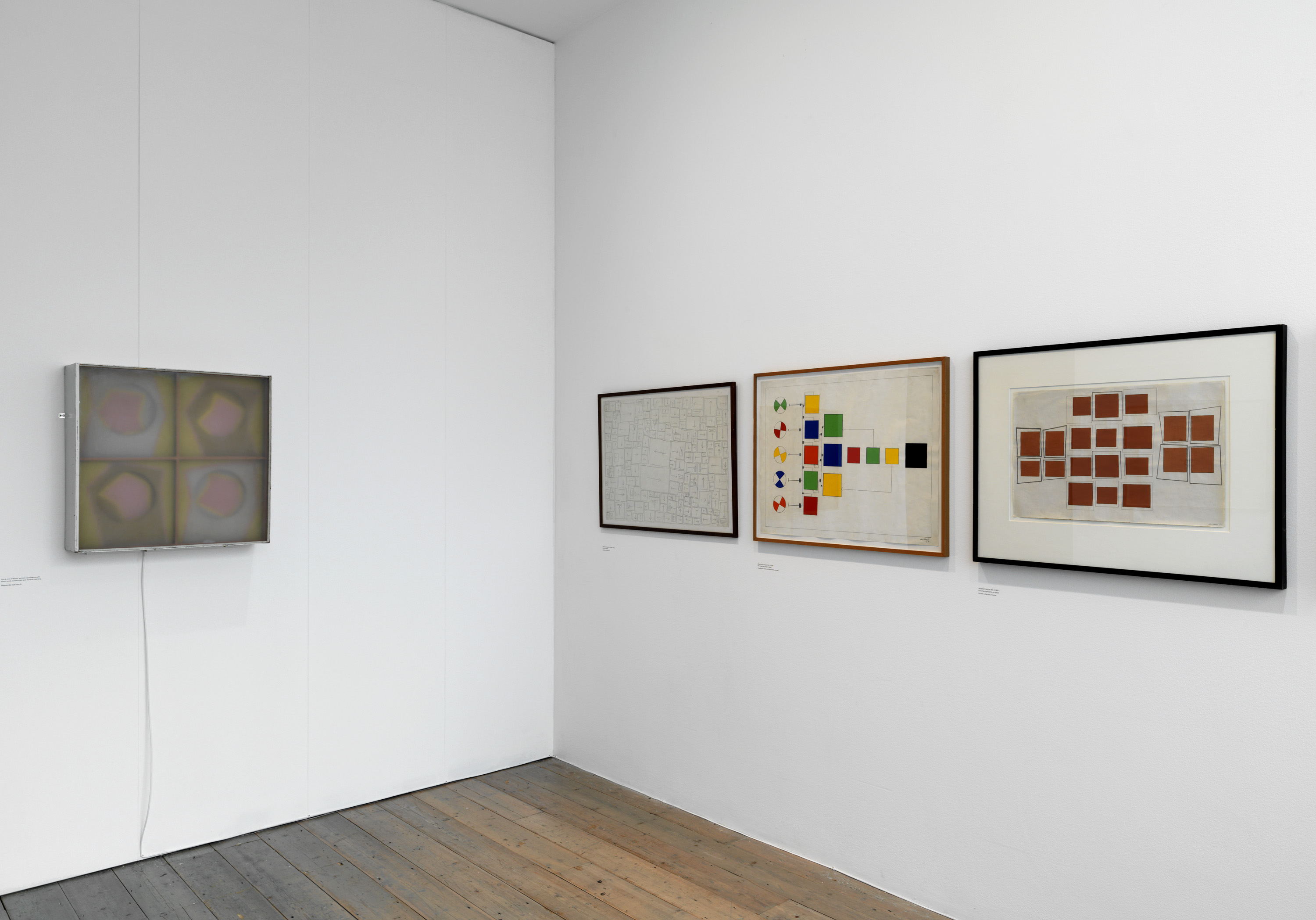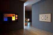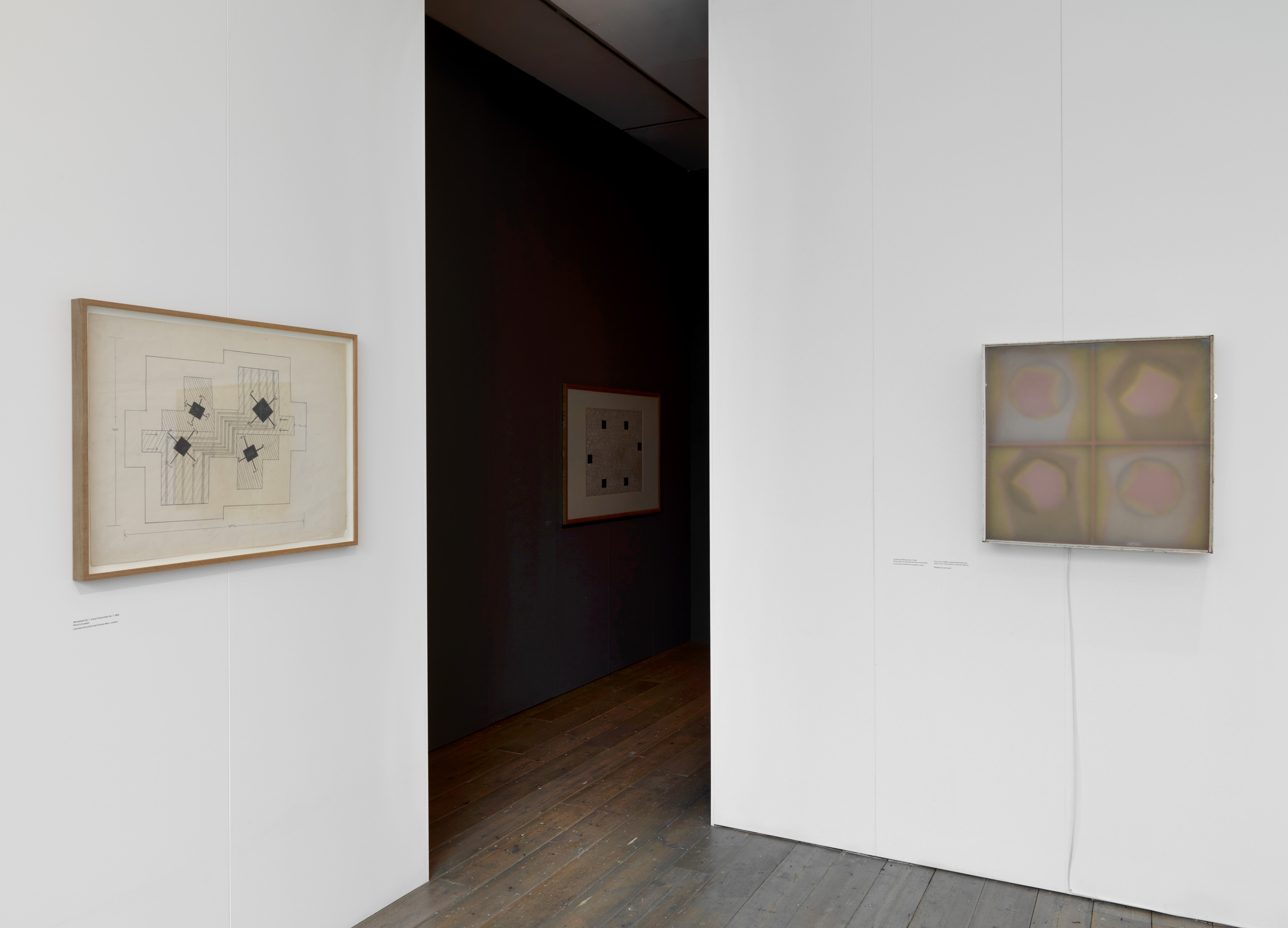 In 1968 Willats made an exhibition at the Museum of Modern Art Oxford in which he presented constructions involving movement and light – some wall-mounted, others large-scale environments – that were informed by his interest in contemporary theories: about probability and prediction, behavioural science, subliminal advertising, and colour in relation to motivation and learning. The display of these at Raven Row will be based on the darkened maze in which they were installed at Oxford, where they were proposed as experimental stimuli for 'states of consciousness'.