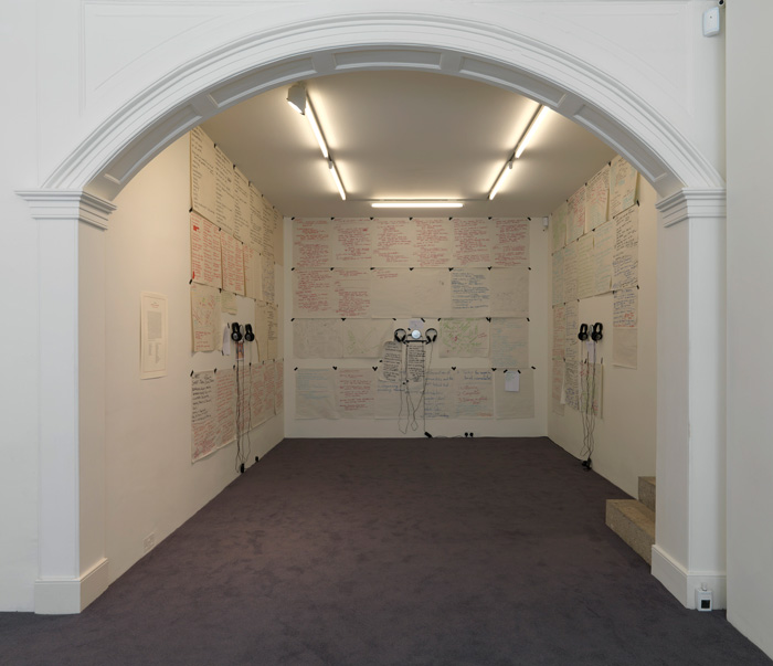 Ultra-red was founded in Los Angeles in 1994. It currently comprises nine artists and political activists who use sound to engage in community struggles in Europe and North America, for example in issues of social housing and immigration. During a residency at Raven Row they have hosted workshops with local activists using the art of sound to consider methods of community activism. In the shopfront gallery they will collectively develop their research, adding sound recordings over the course of the exhibition.