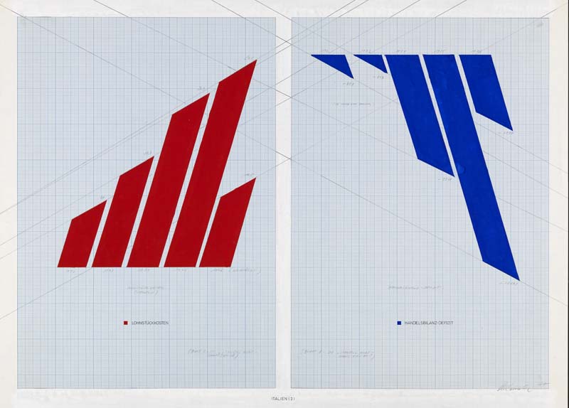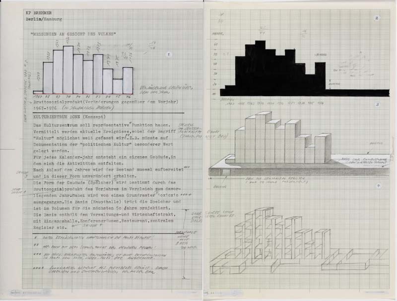 From West Berlin, Brehmer confronted the visual regimes of the Cold War, interpreting the city's double life of socialism and capitalism. Using common information systems as templates – figures and charts from educational books and magazines, maps of racism and fascism and graphics from sociological studies – he linked data-management to the operations of capitalism, and anticipated much of the effects of its globalisation familiar today. In sympathy with (though not a member of) the Deutsche Kommunistische Partei when it was banned in West Germany, he authored his work using the initials of his first names, Klaus Peter.